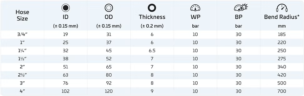 Bend radius values are for outer smooth hoses with spiral steel wire reinforcements.
